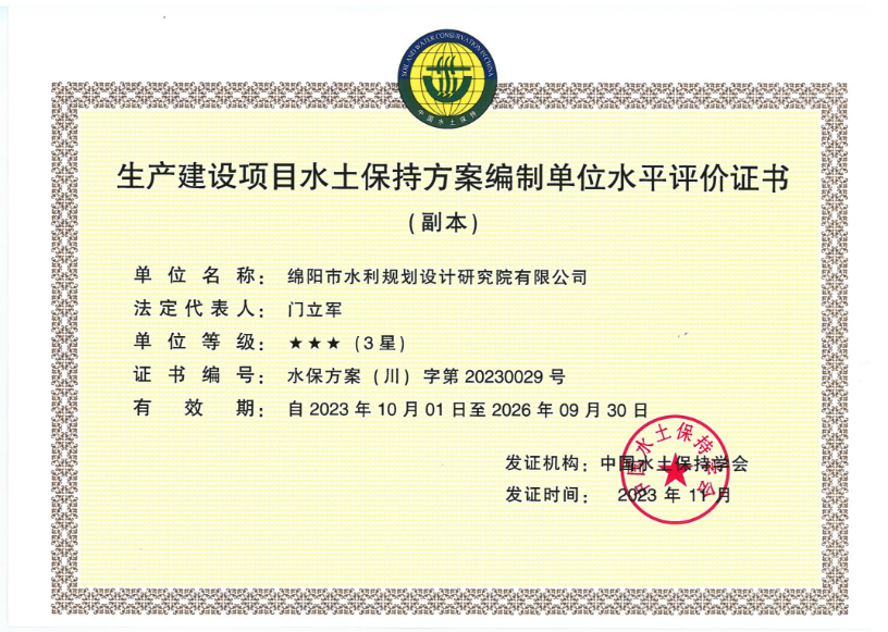 本次水平评价定级是对我公司在水土保持方案编制方面技术实力的认可,一定程度上增强了行业竞争力,进一步激励我们为业主单位提供更优水平、更高质量的服务!