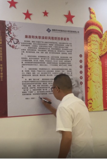 根据公司党总支关于“青廉说”系列活动指示要求,支部组织45周岁以下的全体党员、干部职工开展践诺仪式,集体朗读并签订了《廉政和失职渎职风险防控承诺书》,进一步增强了广大党员、干部职工知敬畏、存戒惧、守底线的规矩意识和责任意识。大家纷纷表示会严格遵守廉洁履职各项规定,将《承诺书》要求作为日常工作的行为准则,把承诺内容化作实际行动,随时提醒自己、警示自己,坚决做到严守纪律底线、不越纪律红线。