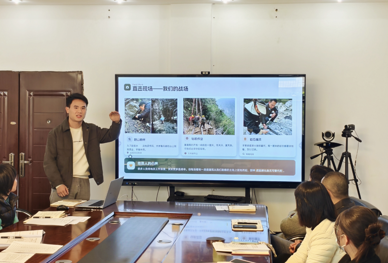随后,勘察部康鑫同志带来《脚下的世界,眼中的蓝图—— 地质专业工作探秘》主题分享。他以通俗易懂的语言,从地质专业核心定义、工作全流程“四部曲”、现场勘探实操要点及岩芯背后的地质故事四个方面,生动解读了地质勘察工作的专业内涵。鲜活的案例、清晰的逻辑让在场人员对勘察工作有了更全面、更深入的了解,有效增进了跨岗位之间的专业认知。